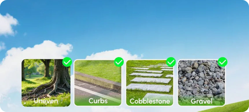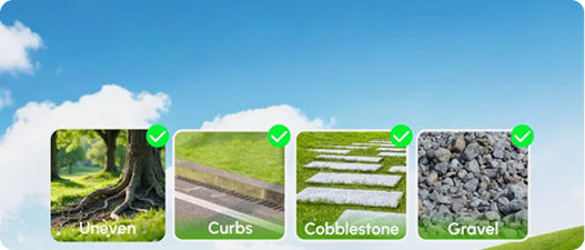 Easily conquer complex terrains—steep slopes up to 70% (35°), tree roots, rocky patches, and uneven surfaces.